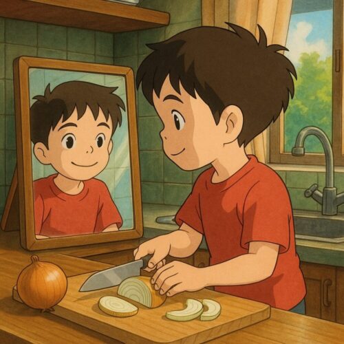 まな板の横に鏡を置いて、鏡に写る玉ねぎを覗き込んで切り始めました…